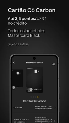 Odaberite karticu koja odgovara vašem životnom stilu iz naše palete ekskluzivnih kreditnih opcija. C6 Carbon nudi iznimne nagradne bodove, povrat novca i neograničen pristup VIP salonima, dok C6 Black pruža robusne pogodnosti za putovanja. Za svakodnevnu praktičnost, tu je C6 Platinum s nultom godišnjom naknadom i bodovima koji se mogu zamijeniti za povrat novca. Sve naše kartice obogaćene su pogodnostima Mastercard programa. Nadalje, uz C6 Bank, vaše su digitalne novčanike poput Google Wallet i Samsung Wallet besprijekorno integrirane, omogućujući vam brze i sigurne transakcije, uključujući direktan Pix bez otvaranja bankovne aplikacije.