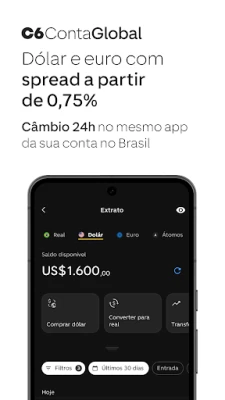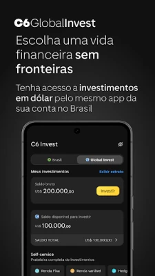 Zakoračite u svijet bezgraničnih transakcija uz C6 Conta Global. Uživajte u povoljnim komercijalnim tečajevima i nižim maržama, štedeći značajno na naknadama u usporedbi s tradicionalnim međunarodnim karticama. Bez mjesečnih troškova za kupnje, podizanje gotovine i prijenose diljem svijeta, te uz međunarodnu debitnu karticu prihvaćenu u preko 190 zemalja i 24-satnu mjenjačnicu, vaše su financije uvijek dostupne. Proširite svoj portfelj s bogatim izborom domaćih i međunarodnih investicija – od dionica i obveznica do Time Deposita, ADR-a, ETF-ova i REIT-ova – sve jednostavno dostupno putem vaše tekuće aplikacije.