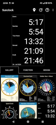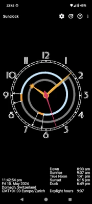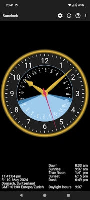 Sunclock je napredni astronomski sat koji prikazuje ne samo civilno vrijeme, već i precizna vremena izlaska i zalaska sunca te sve faze sumraka. Osigurava vam potpun i točan uvid u prirodni tijek dana.